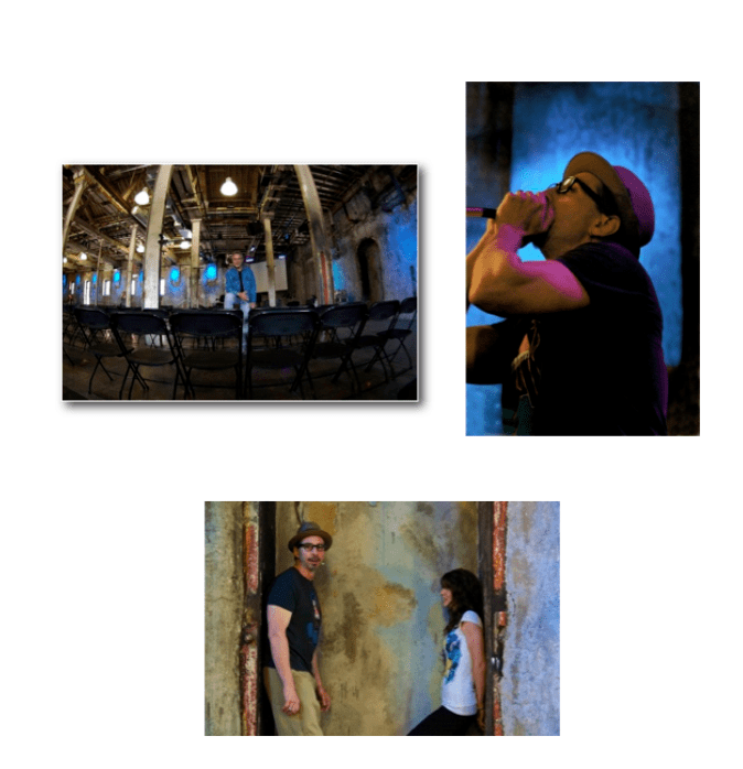 Once I got my dose of both art and caffeine, I embarked. No sooner did I hit the bright sun than, behold, an open door leading into (you gotta picture this), a cavernous stone textured walled grotto, complete with exposed steel pipes, abandoned and rusted ancient machinery… (keep picturing, stay with me now), an abandoned stage eerily lit with indigo blue lights mixed with shards of incoming sunlight from huge windows…and nobody in sight. A perfect studio if there ever was.